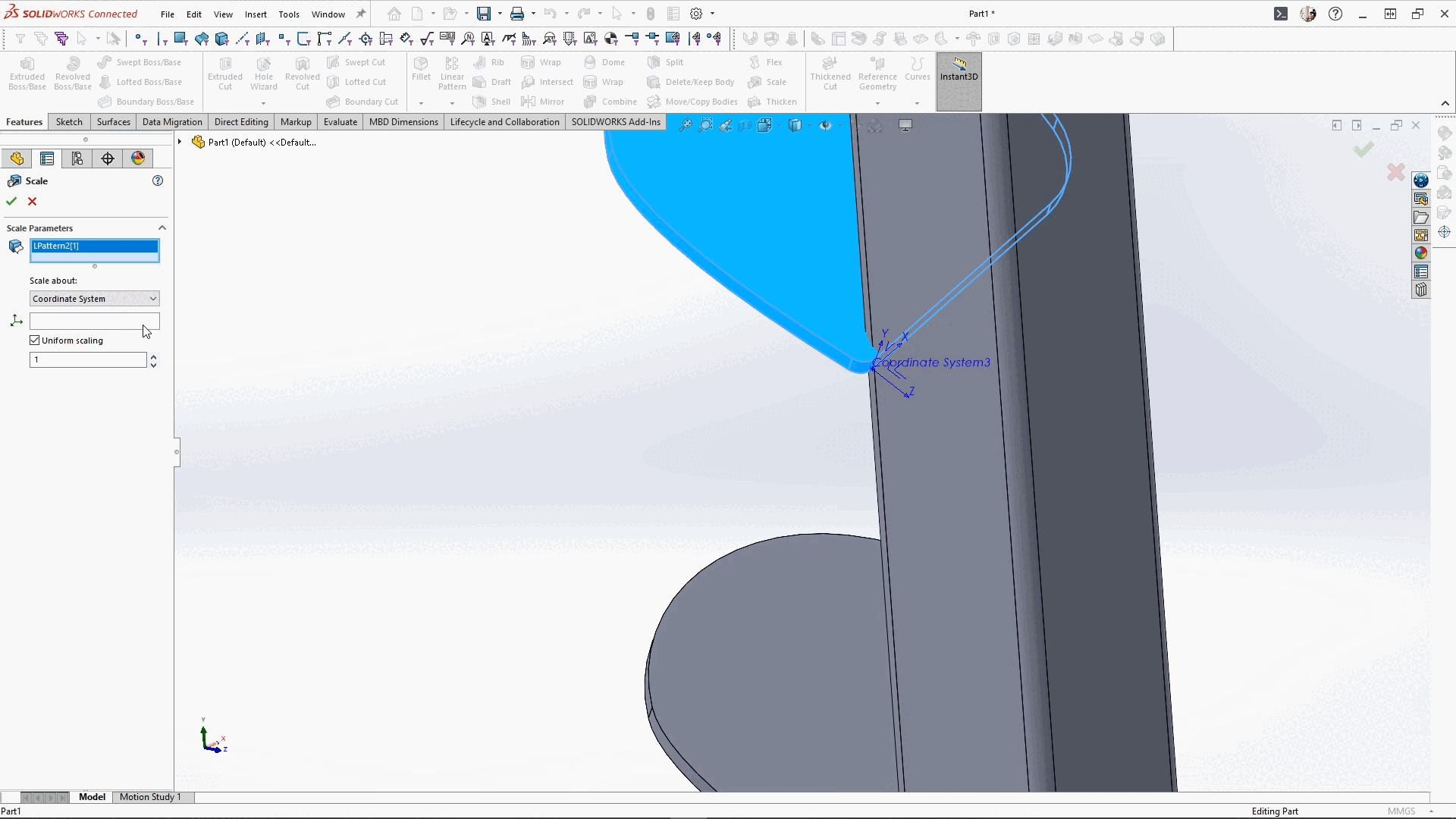 ● 添加坐标系统:由于变量模式无法旋转叶子,所以先为每片叶子添加坐标系统。在参考几何下选择坐标系统,以第二片叶子为起点(第一片保持原大小),选择叶子的角落点,再选择边缘作为X和Y轴进行附加。应用后,若看不到坐标系统,可在视图选项下切换视图。对每片叶子重复此操作。 ● 缩放叶子:使用缩放功能,选择第二片叶子作为缩放实体,在缩放约束下将下拉菜单更改为坐标系统,选择实体坐标系统。取消勾选均匀缩放,在X轴和Z轴上输入1.1(忽略Y轴,避免叶子变厚),应用后从顶视图看,叶子放大效果更明显。对每片叶子重复此功能,以0.1的增量缩放,最后一片缩放到1.5。 |