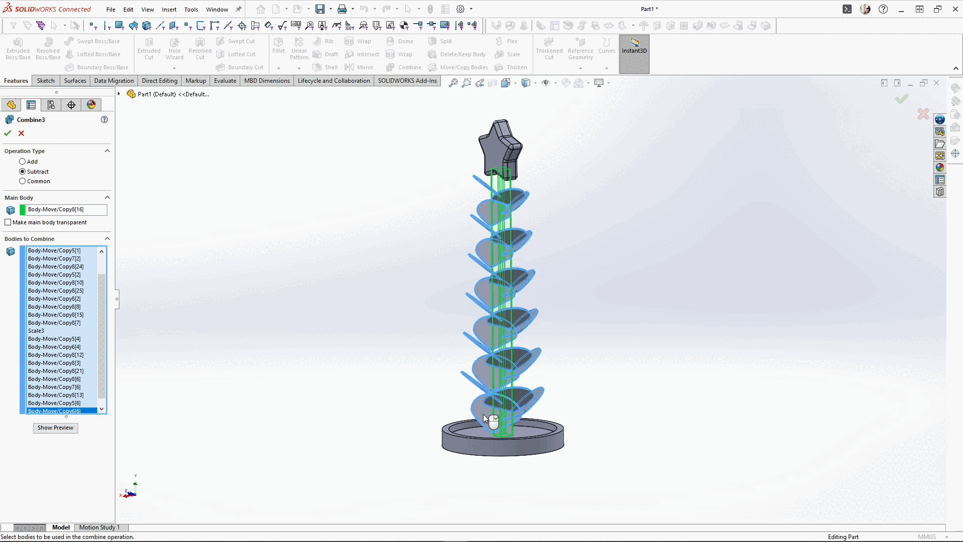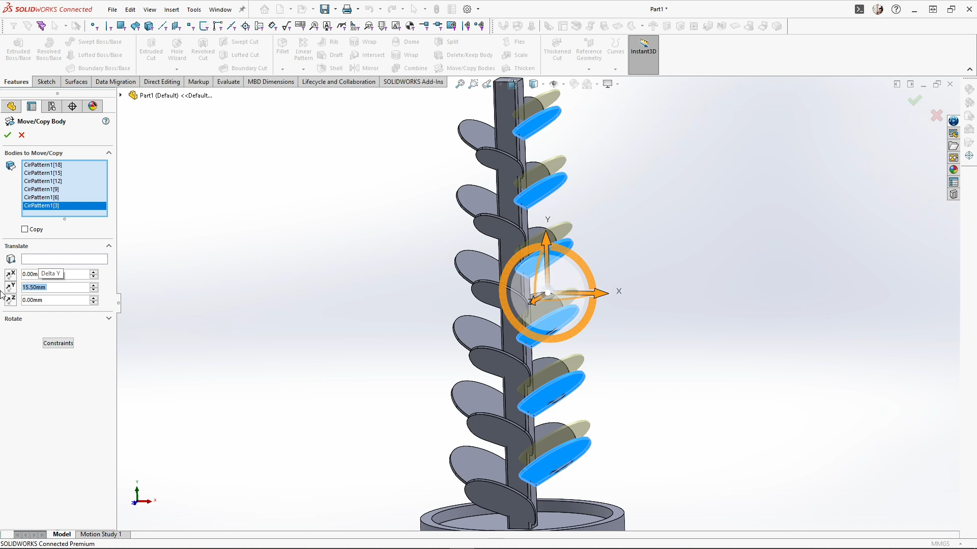 圆形排列与高度错开● 圆形排列:使用圆形排列将6片叶子以360度均匀排列4次。 ● 错开叶子高度:为了让树干更逼真,铃铛能像在螺旋楼梯上一样沿着叶子滚动,需要错开叶子高度。使用移动/复制实体功能,选择一列叶子(不勾选复制),将其向下移动15.5毫米;选择下一组6片叶子,向下移动31毫米,这是最低的一层;最后将最后一列叶子向上移动15.5毫米。 |