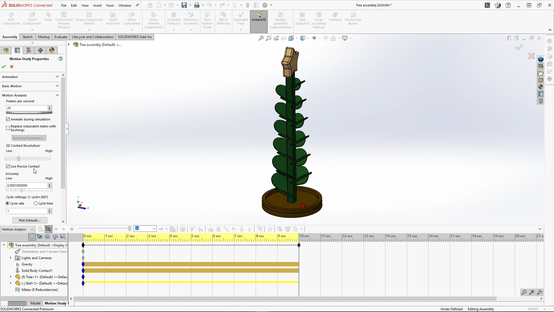 外观与动作分析:赋予生命与活力● 添加外观:模型完成后,应用一些外观,让树更具节庆氛围,并将树带入组合中。 ● 放置铃铛:在树顶的最后一片叶子上放入铃铛零件。 ● 动作分析研究:在动作分析研究标签中,选择动作模拟分析,在研究中沿Y轴施加重力,同时对树和铃铛零件施加接触。在动作分析研究属性选项中,确保开启精确接触。 |